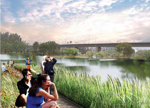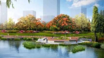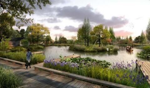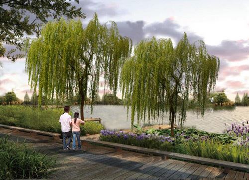 依托現(xiàn)狀地形地貌,打造親水平臺,結(jié)合用地規(guī)劃打造條狀小游園。